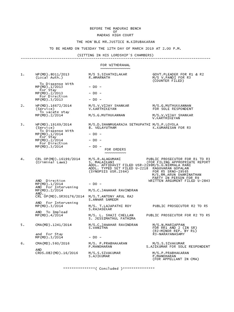 Madurai Bench Cause List Tamil Nadu Tamils